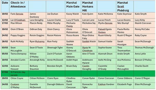 February-March 2026 Tuesday/Thursday evening Volunteer Rota